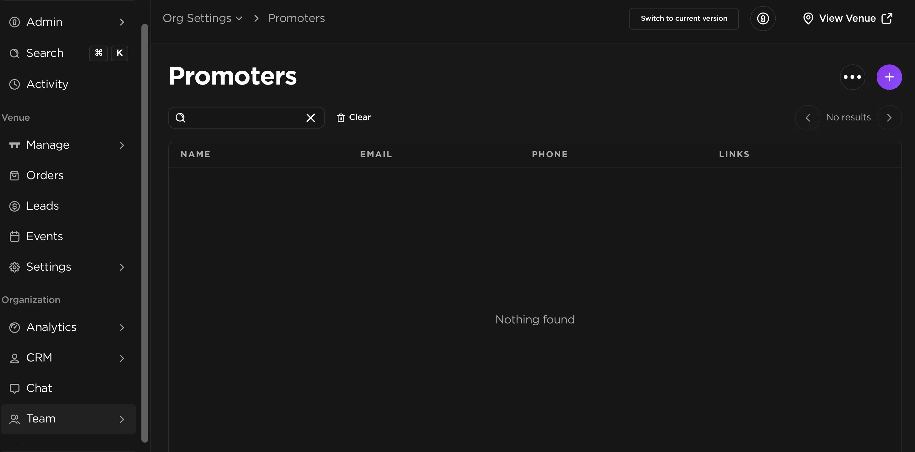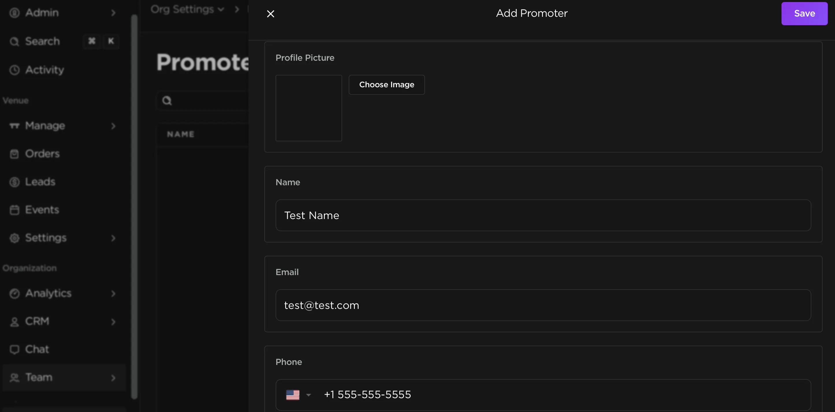 To add a promoter, open the sidebar, click Team, click Promoters, then click the purple plus sign on the right.
